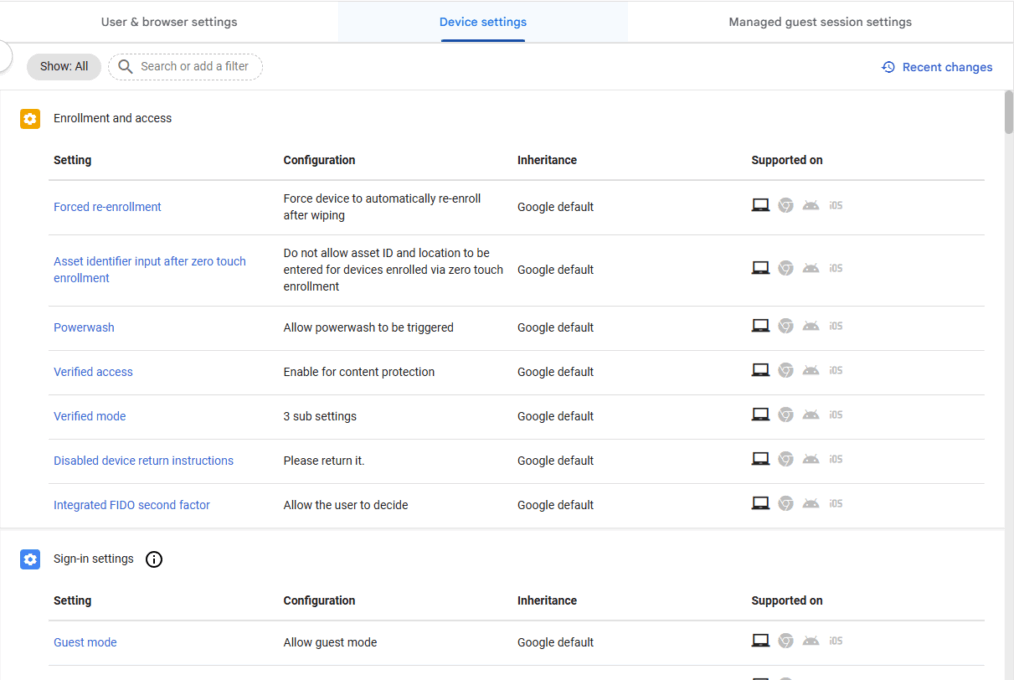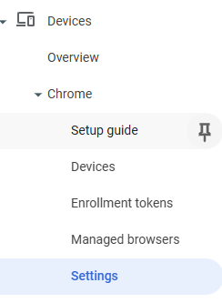 11. Now that the Kiosk application has been added to Chrome’s KIOSKs and configured, the final step is a crucial settings update. Navigate to Devices -> Chrome -> Settings.