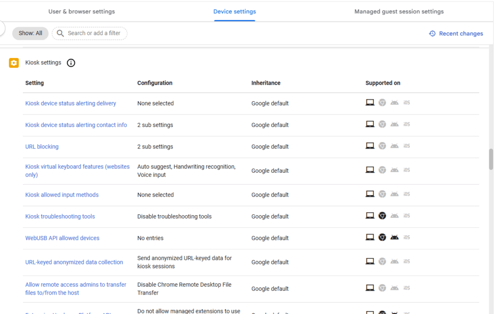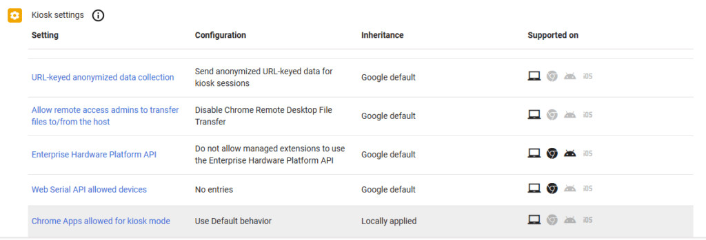 15. Under Kiosk Settings, select the setting called Chrome Apps allowed for Kiosk mode.