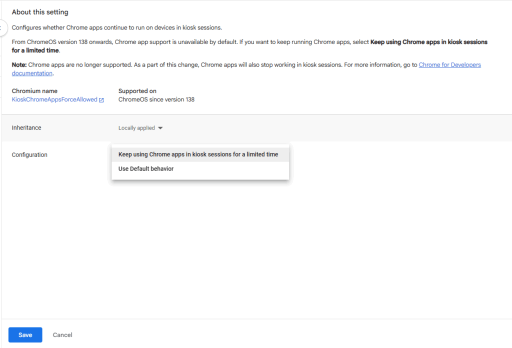 16. On this settings page, go to the Configuration section and ensure that the option Keep using Chrome apps in kiosk sessions for a limited time is selected. Then click Save to confirm the setting.