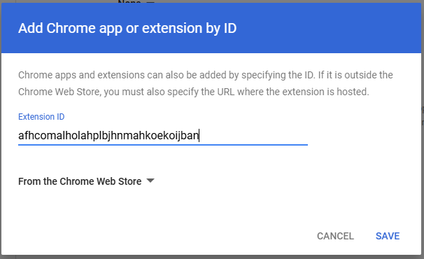 6. In the pop-up that appears, enter afhcomalholahplbjhnmahkoekoijban in the Extension ID and select Save.