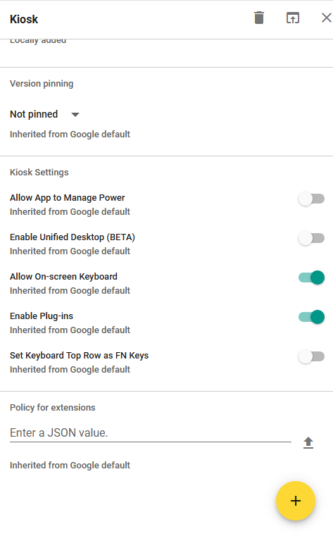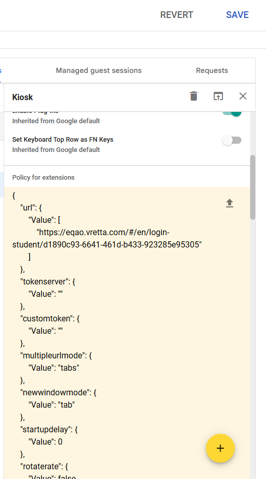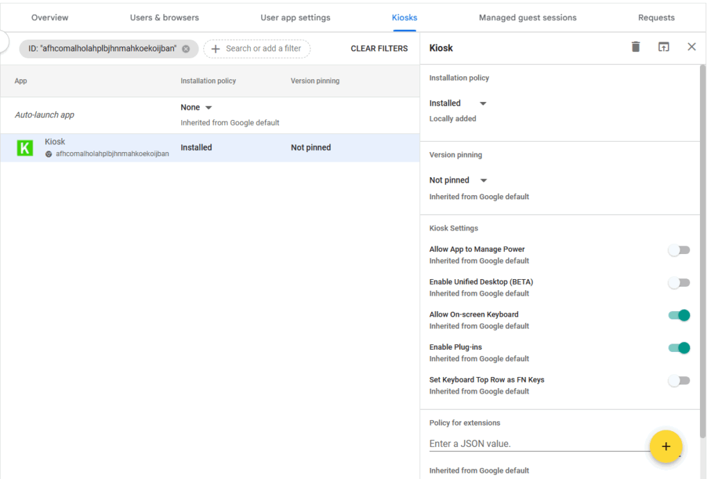 10. Locate the KIOSK policy document for your school or board, which is available from any Administrator or Board account. This document is a JSON file. To configure KIOSK, open that file in a text editor, copy the contents of the file, and paste them into the Enter a JSON Value field. Then click Save at the top of the page.